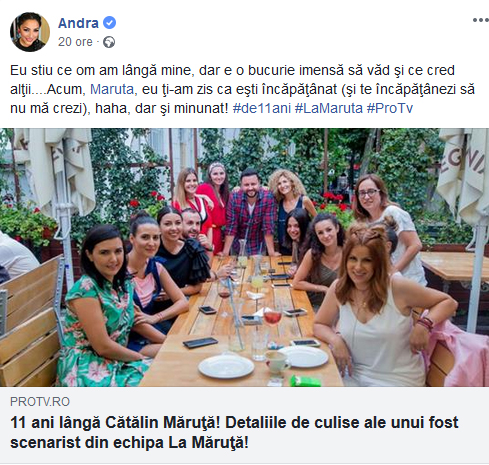 Andra și Cătălin Măruță au împreună o familie frumoasă, alături de cei doi copii, David și Eva, și este considerat unul dintre cele mai solide cupluri din showbizul autohton. Cântăreața a postat un mesaj pe rețelele de socializare, după ce un fost scenarist a făcut declarații uluitoare. (Citește AICI mai multe)