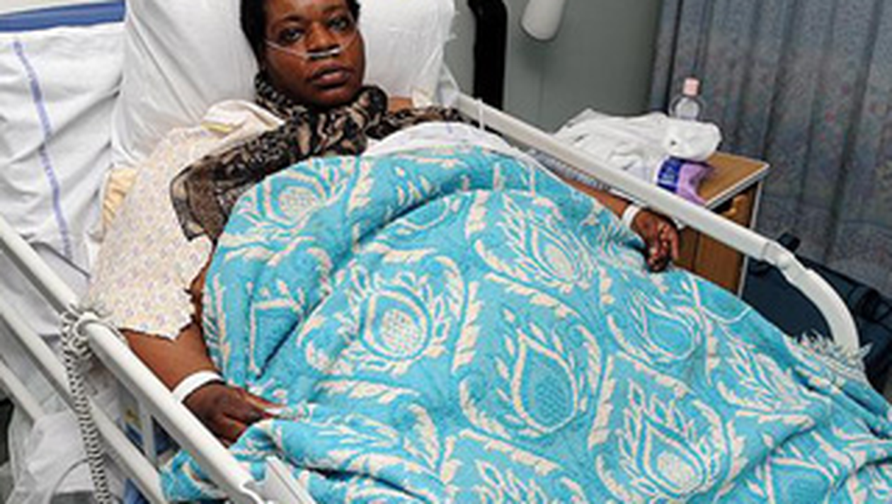 Joanne Ettiene, o britanica in varsta de 45 de ani si care cantareste 254 de kilograme, a avut nevoie de ajutorul mai multor pompieri si asistenti medicali pentru a putea fi transportata la spital.