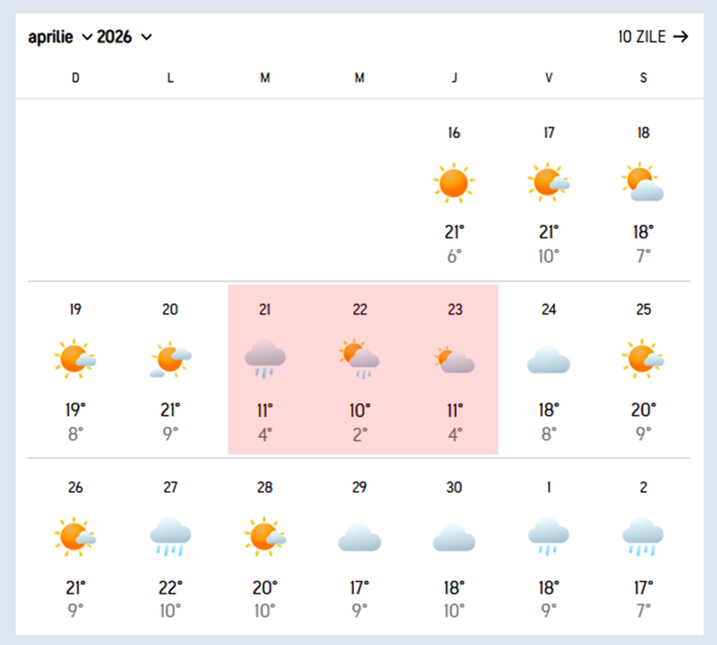 Meteorologii subliniază că nu este vorba despre o răcire de durată. Din contră, 21 aprilie va deschide o scurtă perioadă de aproape trei zile caracterizată de temperaturi scăzute, după care vremea va intra într-un proces rapid de încălzire.