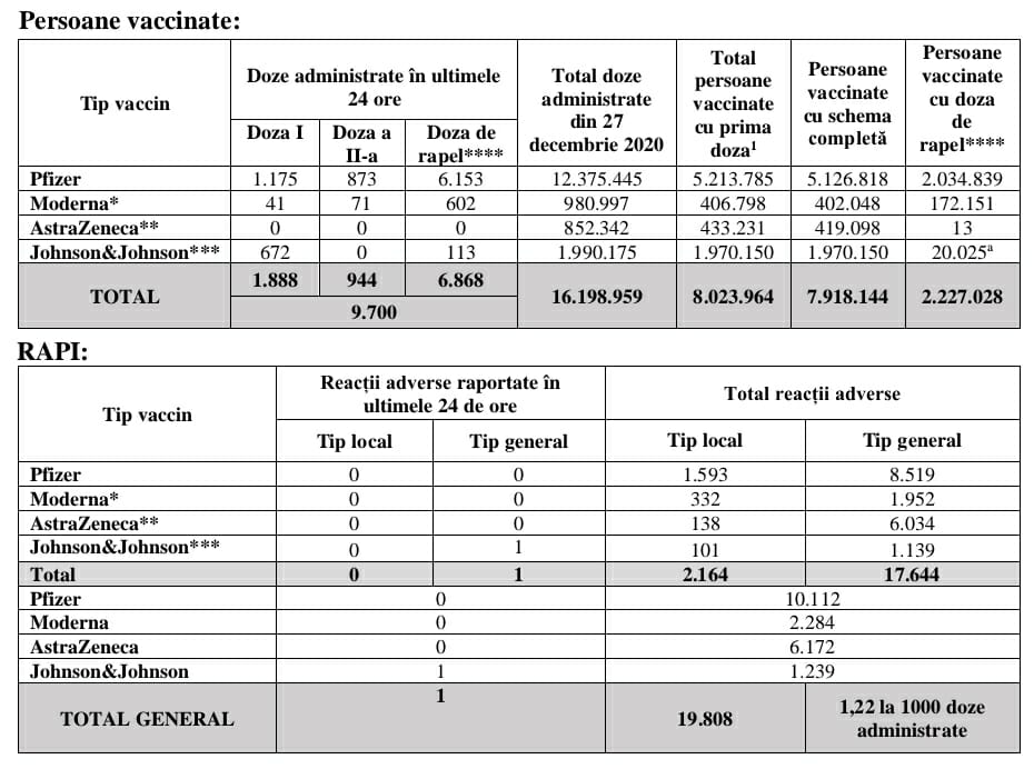 Comitetul Național de Coordonare a Activităților privind Vaccinarea împotriva COVID-19 (CNCAV) a prezentat evidența imunizărilor din ziua de 16 ianuarie, până la ora 17:00.