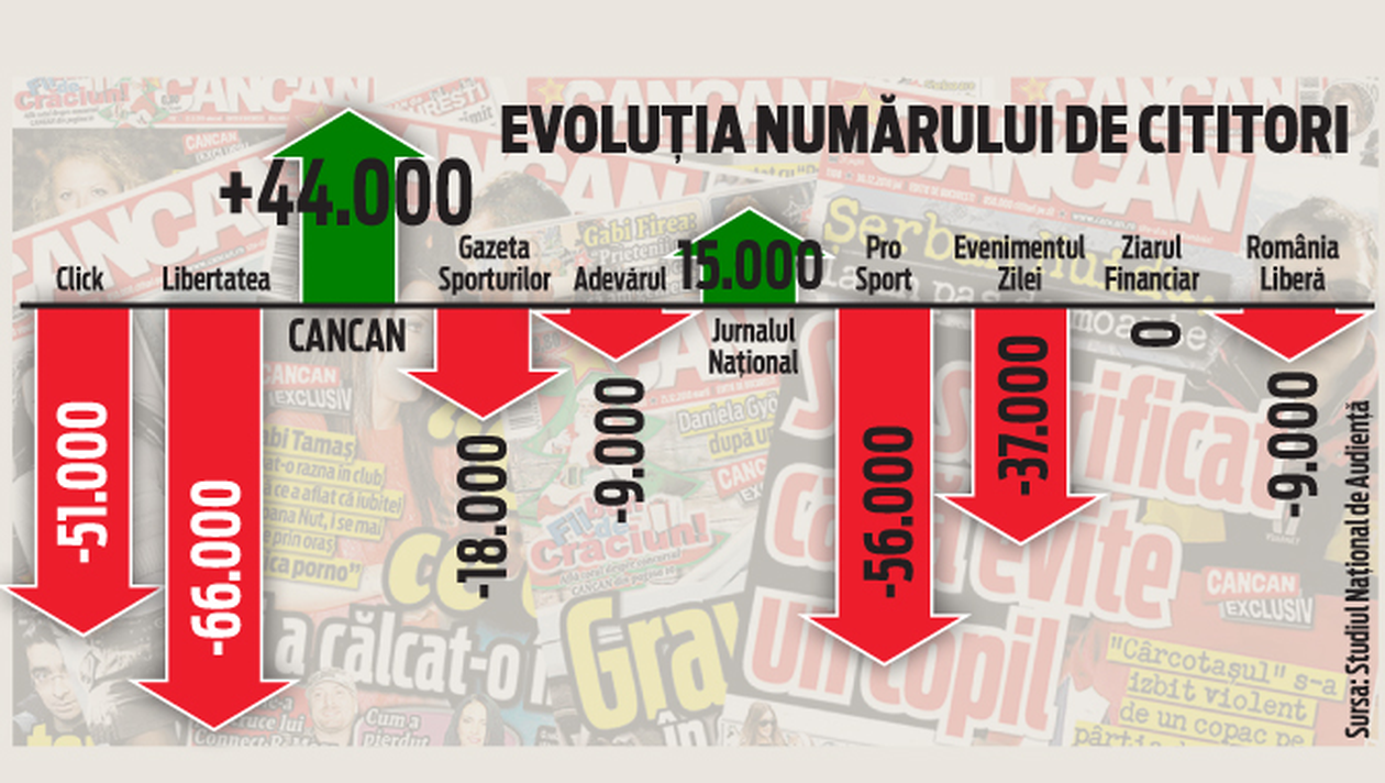 Fata de aceeasi perioada din 2009, tabloidele concurente au pierdut anul trecut in total peste 110.000 de cititori. Astfel, numarul de cititori ai ziarului „Libertatea” a scazut cu 66.000, iar al celor de la „Click!”, cu 51.000, in vreme ce CANCAN a castigat 44.000 in perioada 18 ianuarie 2010 – 19 decembrie 2010 fata de anul 2009. Drept urmare, numarul cititorilor CANCAN a ajuns la aproape 900.000, iar cifra este in continua crestere. Aceste estimari au fost date publicitatii ieri de catre Studiul National de Audienta, iar rezultatele au fost obtinute in urma sondarii opiniei cetatenilor cu varste cuprinse intre 14 si 64 de ani, pe un esantion reprezentativ de 19.558 de persoane. Multumim cititorilor pentru increderea acordata si le promitem noi dezvaluiri senzationale in ziarul CANCAN.