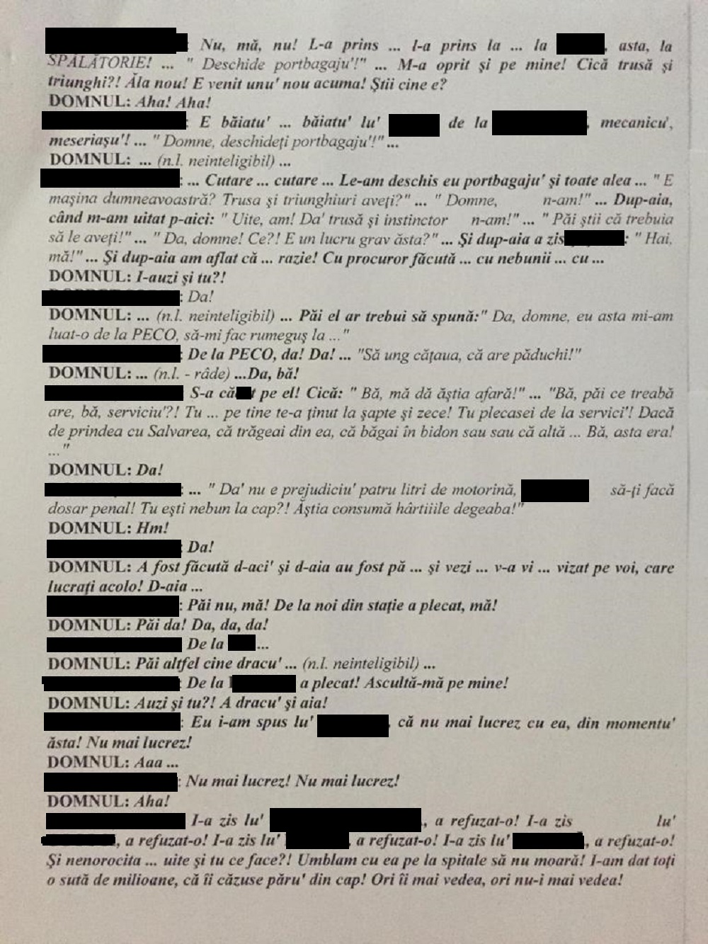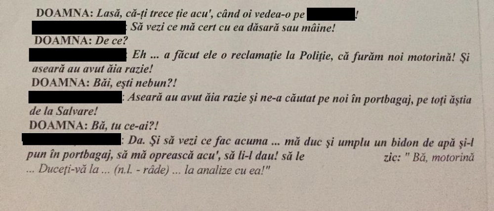 Între timp au apărut şi stenogramele în care, potrivit unor discuţii între angajaţii de la Serviciul de Ambulanţă Corabia, cea care i-a “turnat” pe şoferi este o asistentă medicală care era în conflict cu cei 13 şoferi. În momentul în care au început controalele, potrivit stenogramelor, şoferii s-au speriat şi au încercat să o ţină la distanţă pe asistenta care îi reclamase.