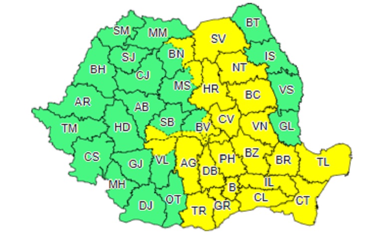 ANM anunță că, până la ora 23.00, în Muntenia, Dobrogea, jumătatea de vest a Moldovei, Carpații Orientali și local în Carpații Meridionali vor fi perioade cu instabilitate atmosferică accentuată ce se va manifesta prin averse cu caracter torențial, frecvente descărcări electrice, intensificări de scurtă durată ale vântului, vijelii și pe arii restrânse grindină. În intervale scurte de timp sau prin acumulare, cantitățile de apă vor depăși 20…25 l/mp și izolat 40…50 l/mp. (DETALII AICI)