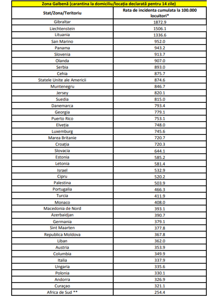 Sunt 43 de țări care figurează pe lista țărilor cu risc epidemiologic ridicat, majoritatea fiind din Europa. Republica Moldova rămâne pe listă. De asemenea, Statele Unite și Israelul sunt plasate tot în „zona galbenă”. Acum, Italia a fost reintrodusă pe această listă. În schimb, iese din listă Bulgaria, deci cei care vin din această țară nu vor mai trebui să stea în carantină.