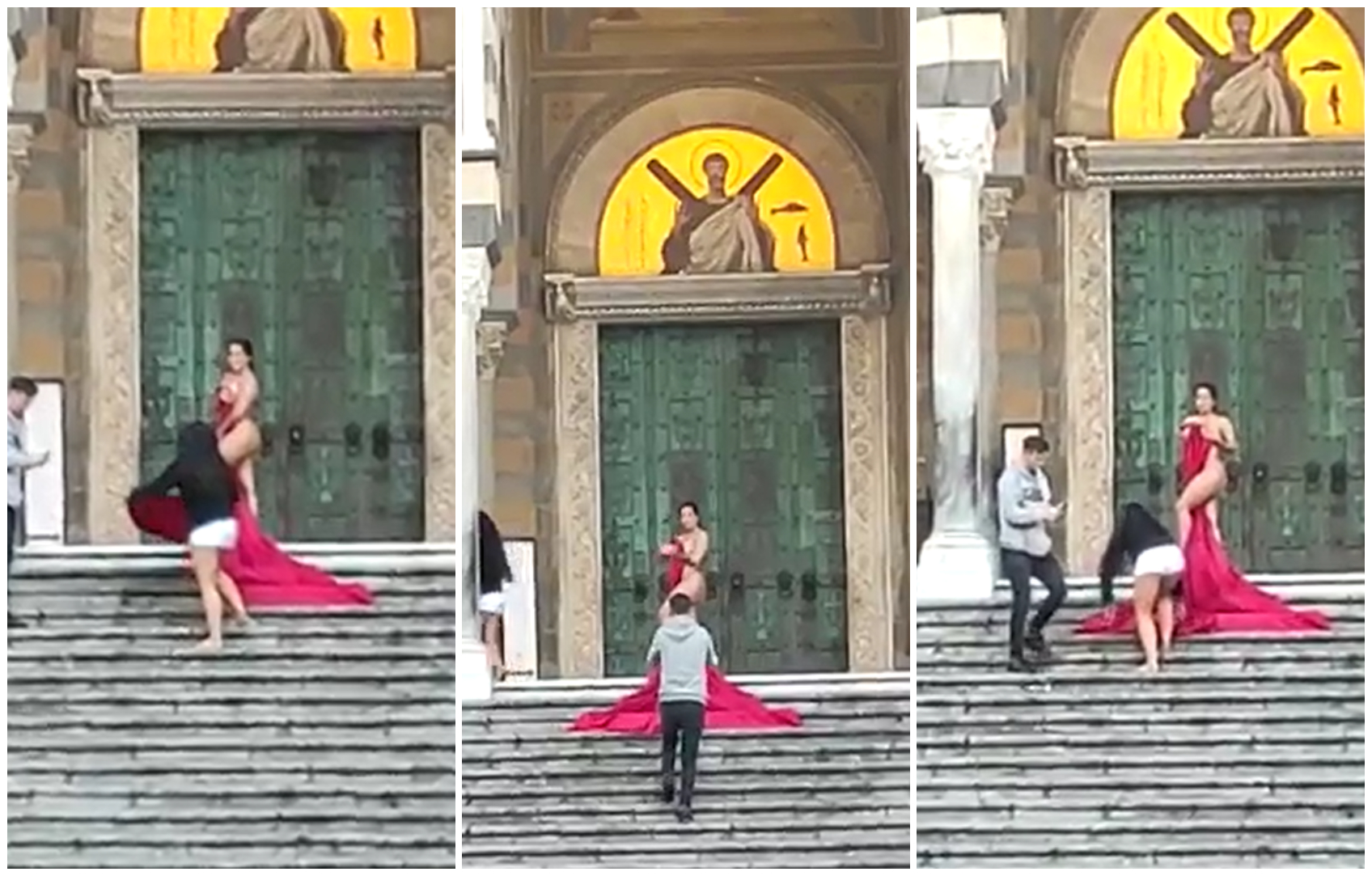 Pentru că a vrut să aibă parte de o amintire din vacanță, o turistă și-a acoperit trupul pe jumătate cu o bucată de material textil de culoare roșie, apoi a stat să își facă fotografii semi-nud. Tânăra nu era singură, ci însoțită de doi bărbați. Mai mult decât atât, ședința foto s-a desfășurat pe treptele unei catedrale celebre pe Coasta Amalfi din Italia. Catedrala este dedicată Apostolului Sfântul Andrei și a fost contruită în anul 1067, acolo unde se află și moaștele sale.