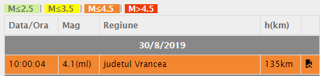 ”În ziua de 30/08/2019 la ora 10:00:04 (ora României) s-a produs în zona seismică Vrancea, județul Vrancea, un cutremur cu magnitudinea 4.1 pe scară Richter, la adâncimea de 135 km.