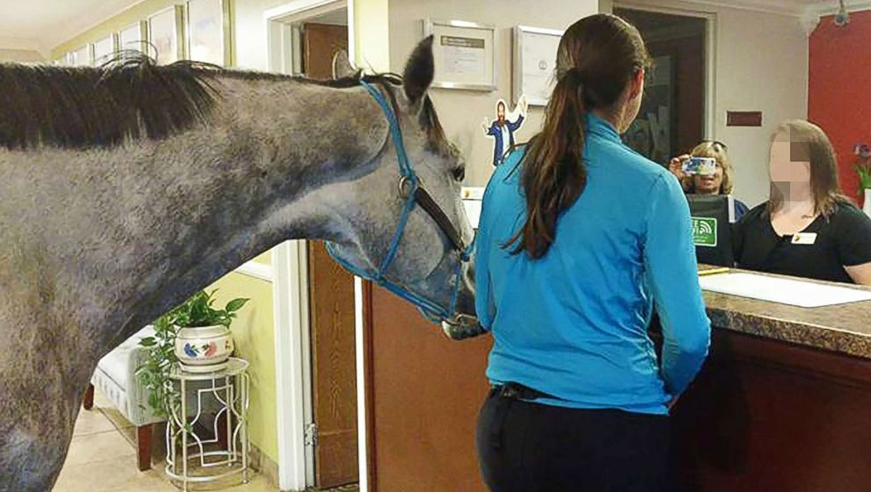 Pe nume Lindsey Partridge, tânăra de 31 de ani din Ontario, Canada, a vrut să petreacă o noapte într-un hotel din orăşelul Lexington, din statul american Kentucky, dar nu a putut să se despartă de calul său de curse pe nume Blizz. Alături de acesta, ea participase la un eveniment în acea zi.