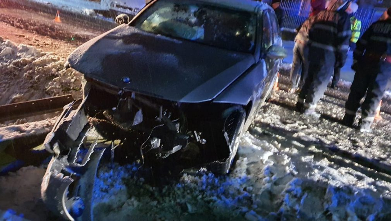Un șofer a derapat pe carosabilul acoperit de zăpadă. A intrat în șanț apoi s-a izbit de un cap de pod. Pasagerul de pe bancheta din spate a autoturismului a rămas captiv între fiarele contorsionate.
