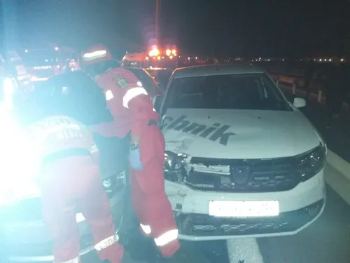 Accident groaznic în lanț pe autostrada București-Pitești. Cinci autoturisme sunt implicate într-un carambol la km 104 pe A1. La fața locului intervin mai multe autospeciale de descarcerare, SMURD și autospeciale cu apă și spumă. O persoană este încarcerată, sub un autoturism. Victima, un bărbat, care era în mașină s-a răsturnat pe o parte, ieșită parțial pe geam, conștientă, cooperantă. Altă persoană prezintă dureri la coloana vertebrală.
