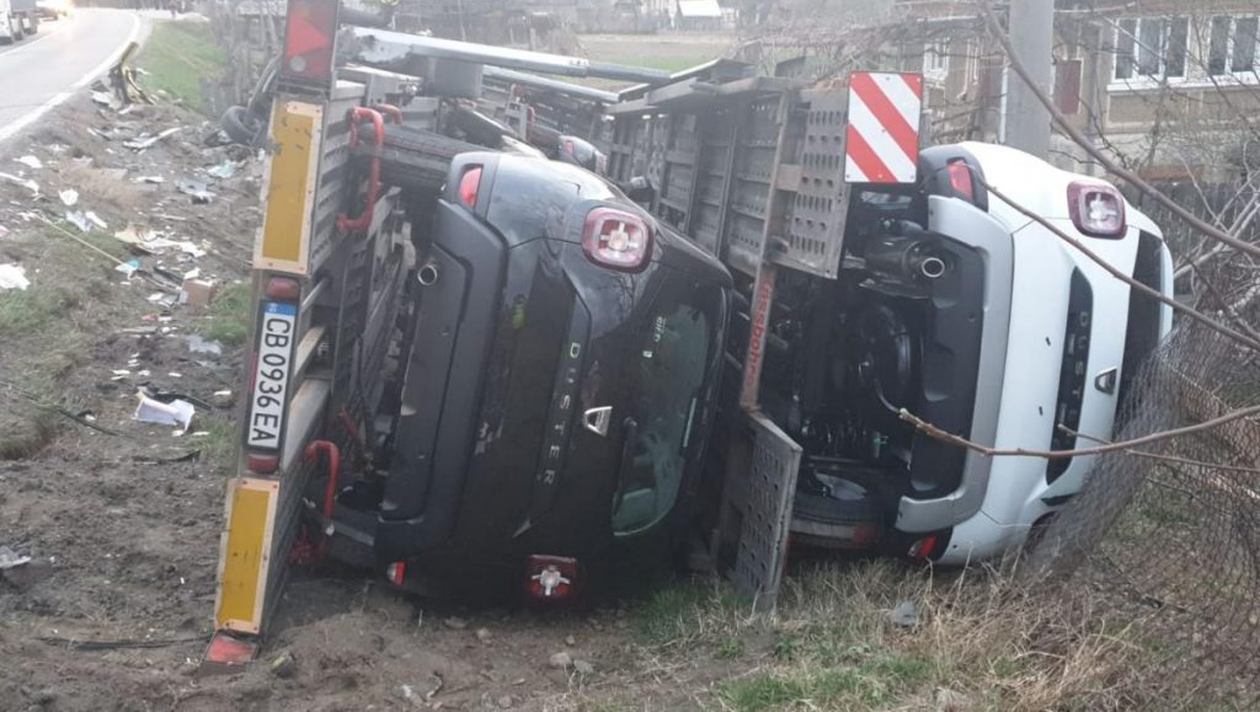 Reprezentanții ISU Vâlcea au declarat că autocamionul care transporta mașini s-a răsturnat, astfel că două autoturisme au căzut de pe platformă în curtea unei locuințe.