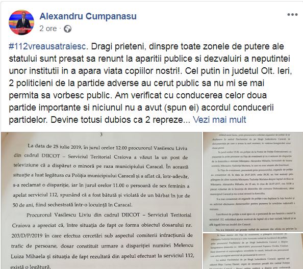 „Dragi prieteni, dinspre toate zonele de putere ale statului sunt presat sa renunt la aparitii publice si dezvaluiri a neputintei unor institutii in a apara viata copiilor nostri!. Cel putin in judetul Olt. Ieri, 2 politicieni de la partide adverse au cerut public sa nu mi se mai permita sa vorbesc public. Am verificat cu conducerea celor doua partide importante si niciunul nu a avut (spun ei) acordul conducerii partidelor. Devine totusi dubios ca 2 reprezentanti ai celor mai mari partide din Romania au cerut asa ceva. Oare de ce? Dvs ce credeti? Considerati ca trebuie continuata aceasta lupta pt adevar si pt copii nostri care aproape m-a secatuit fizic si psihic? Si aproape mi a distrus viata familiala?