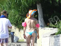 Pus pe fapte mari, bărbatul pe care CANCAN.ro, site-ul numărul 1 din România, l-a fotografiat şi pe care vi-l prezentăm în imagini a decis că e o idee excelentă să pornească aşa spre una dintre plajele din Mamaia. Înarmat cu o pereche de bikini legaţi pe şolduri de culoare turcoaz, care îi puneau în valoare posteriorul, pentru că îl scoteau în evidenţă mai mult decât era cazul, bărbatul a decis să se ferească de razele soarelui cu o pălărie – un model frumos şi înflorat, doar că tot de femei, însă pe care şi-a prins-o şmechereşte precum un cowboy. Totodată, s-a gândit cătrebuie să fie pregătit şi să sară direct în valurile mării. Pentru sesiunea de înot a avut la îndemână, prinsă de fiecare braţ, câte o perniţă gonflabilă, în caz că marea ar fi putut să devină, brusc, extrem de agitată.