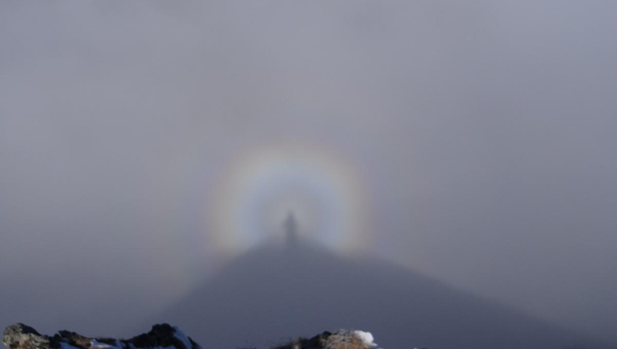 „Acest fenomen apare atunci când o persoană stă pe un vârf de munte, cu soarele în spate şi deasupra unui plafon de nori sau ceaţă şi umbra acestei persoane, împreună cu vârful muntelui se reflectă pe norii sau pe ceaţt de mai jos, iar cele două umbre sunt încadrate central de un curcubeu circular denumit „spectru”. În fotografii se poate observa şi unul din cele mai frumoase drumuri din lume şi anume: Transfăgărăşan, deoarece de pe Vf. Vânătoarea lui Buteanu se deschide o privelişte minunată cu mai multe obiective: Transfăgărăşan, creasta munţilor Făgăraş, Valea Bâlea, Lacul Capra şi Depresiunea Colinară a Transilvaniei. Spectrul montan se mai numeşte şi „Spectrul din Brocken”, deoarece se poate observa des pe Vârful Brocken (munţii Harz) din Germania”, a explicat Valentin Zamora.