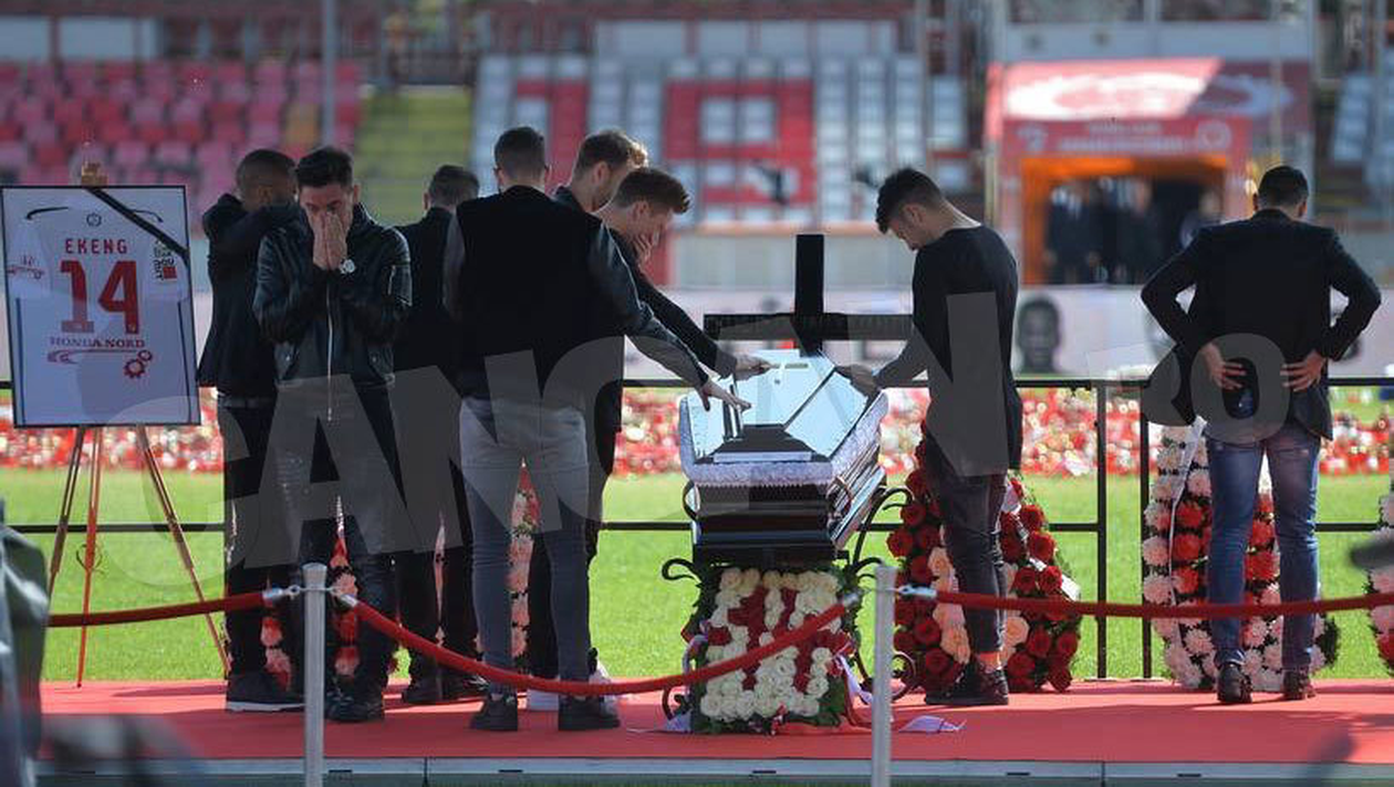 Moartea dinamovistului Patrick Ekeng a adus o profundă durere nu numai familiei, ci şi în inima colegilor săi de echipă. ”Cânii roşii” au fost toţi la căptâiul lui Ekeng, purtând toţi sacouri negre!