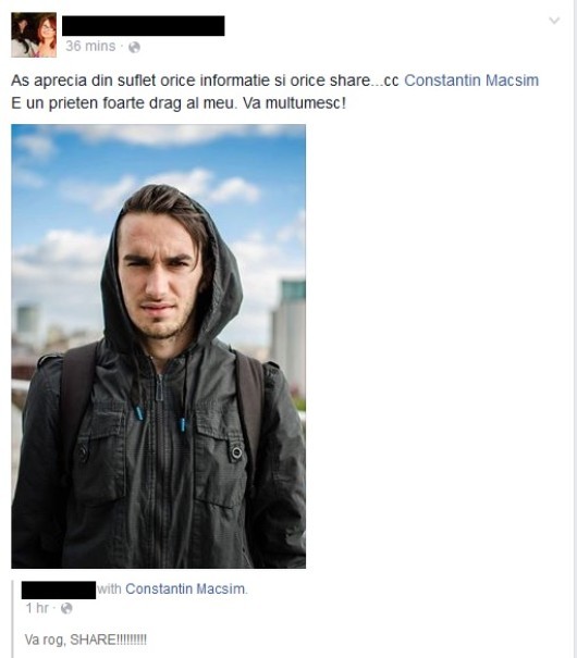 Pagina personală de Facebook a lui Constantin Macsim s-a împânzit de mesaje din partea zecilor de persoane care îl cunosc, îl iubesc şi aşteaptă măcar o veste despre băiat. Acesta a terminat Facultatea de Ştiinţe Politice a Universităţii „Alexandru Ioan Cuza“ din Iaşi, după care s-ar fi mutat în Bucureşti.