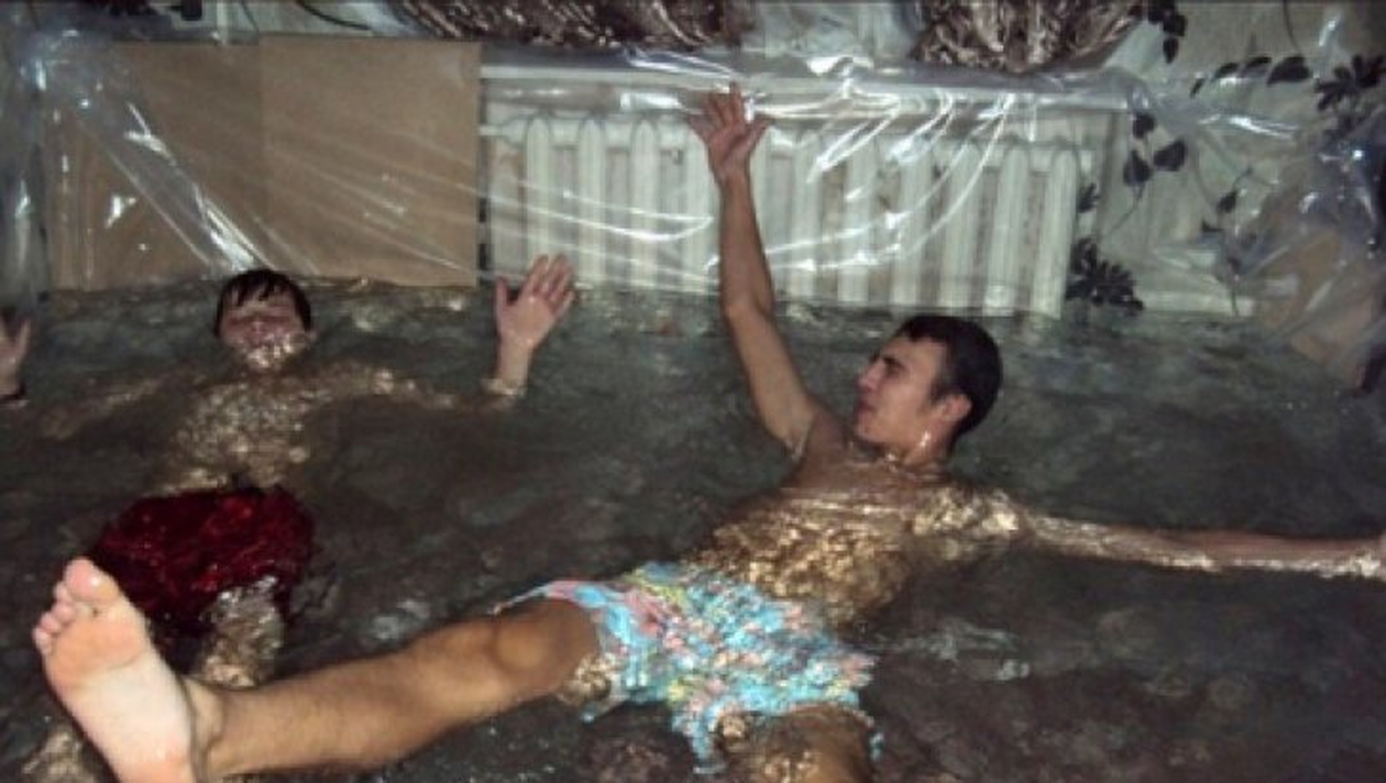 Băieţii, din oraşul rusesc Oryol, au capitonat solul şi întreaga suprafaţa a sufrageriei cu un plastic rezistent, iar apoi, nu se ştie cum, au transformat suprafaţa în piscină, umplând cu apă sufrageria.