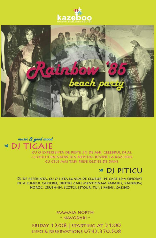Vineri seara, la apus, pe plaja KAZEBOO din MAMAIA, are loc cea mai tare petrecere de August, în stilul anilor '85, perioadă în care blugii erau o formă rebelă şi muzica bună se anunţa doar la petreceri.
