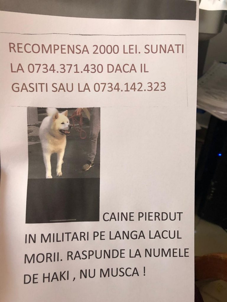 „Câine pierdut în Militari, pe lângă Lacul Morii. Răspunde la numele de Haki. Nu mușcă! Recompensa 2000 lei. Sunați la 0734.371.430 dacă îl găsiți sau la 0734.142.323„, este mesajul distribuit de stăpânul patrupedului.