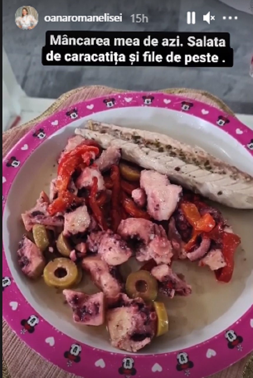 „Mâncarea mea de azi: salată de caracatiță și file de pește” a scris Oana Roman, în dreptul postării de pe Instagram.