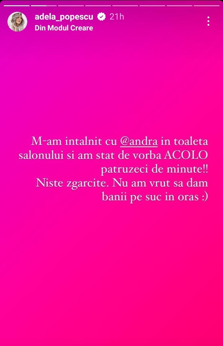 „M-am întâlnit cu Andra în toaleta salonului și am stat de vorbă acolo patruzeci de minute!! Niște zgârcite. Nu am vrut să dăm banii pe suc în oraș”, a fost mesajul Adelei Popescu, în cadrul unui InstaStory.
