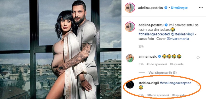 „Îmi provoc soțul să ieșim așa din izolare” (adică…viitori părinți, n.r.). Mai mult, răspunsul lui Virgil nu a întârziat să apară, iar soțul Adelinei Pestrițu le-a arătat tuturor că îi surâde ideea. „Provocare acceptată” a fost răspunsul acestuia, vizavi de descrierea Adelinei.