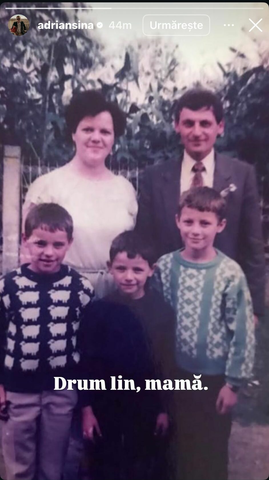 În memoria mamei sale, Adrian Sînă a postat pe rețelele sociale o fotografie emoționantă cu aceasta, însoțită de mesajul simplu, dar profund: „Drum lin, mamă”.