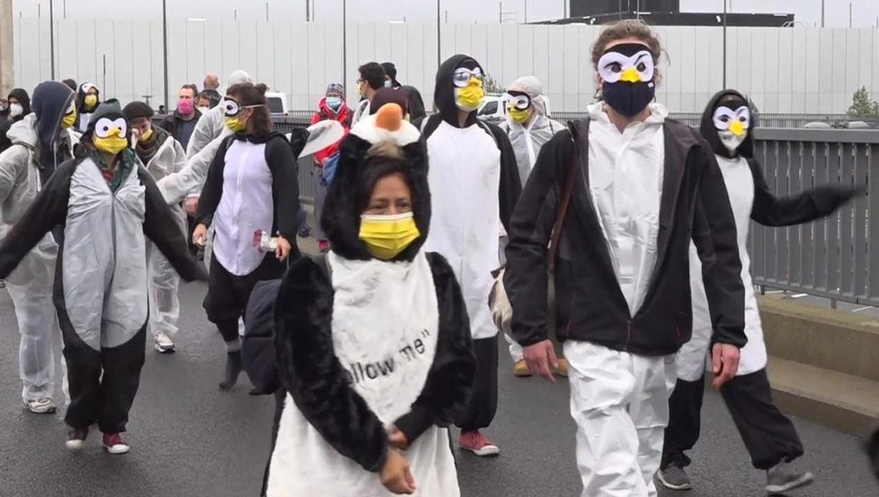 Au protestat deghizați în pinguini