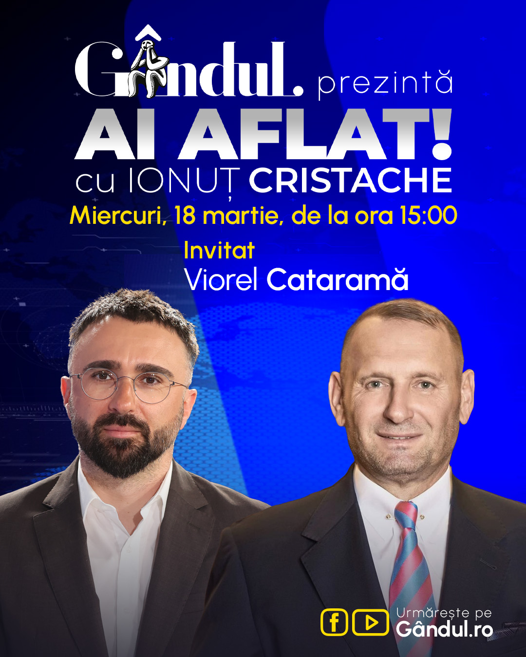„Ai Aflat! cu Ionuț Cristache” începe miercuri, 18 martie, de la ora 15.00, live pe Gândul. Invitat: Viorel Cataramă