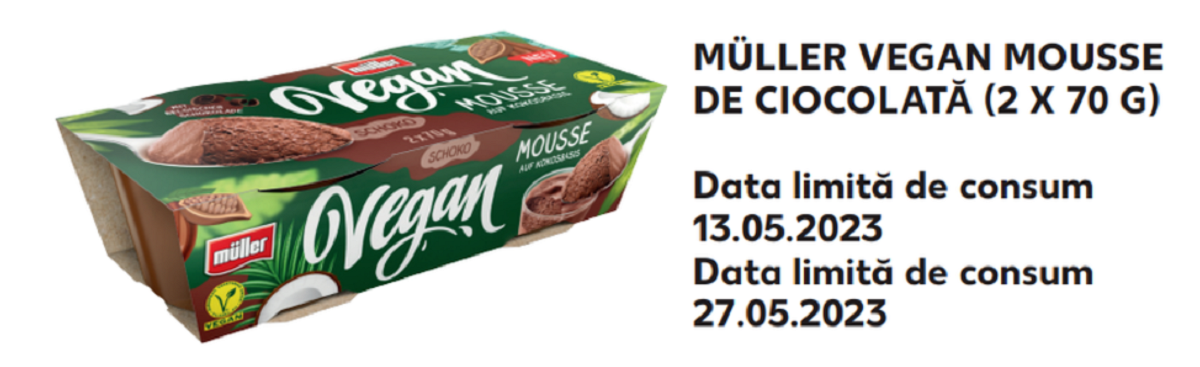 ”Producătorul de lactate Alois Müller GmbH & Co.KG recheamă produsul Müller Vegan Mousse Desert de spumă de ciocolată pe bază de cremă de nuci de cocos (24649 VM Vegan Mousse Schoko) (2 x 70 g) ca măsură de precauţie pentru protecţia consumatorilor.