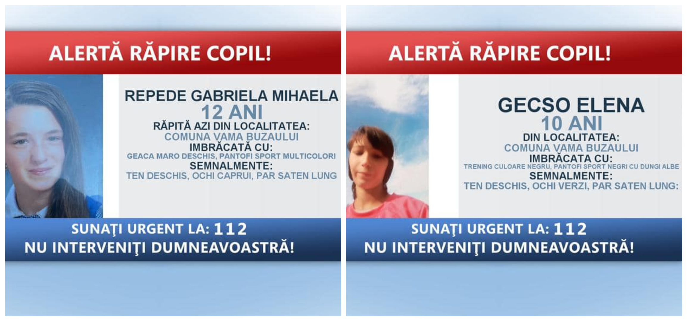 În acest moment, polițiștii îi sfătuiesc pe toți cei care au informații despre acest caz sau descoperă locul în care se află minorele să sune de urgență la numărul de telefon 112 sau să meargă la cea mai apropiată secție de poliție.