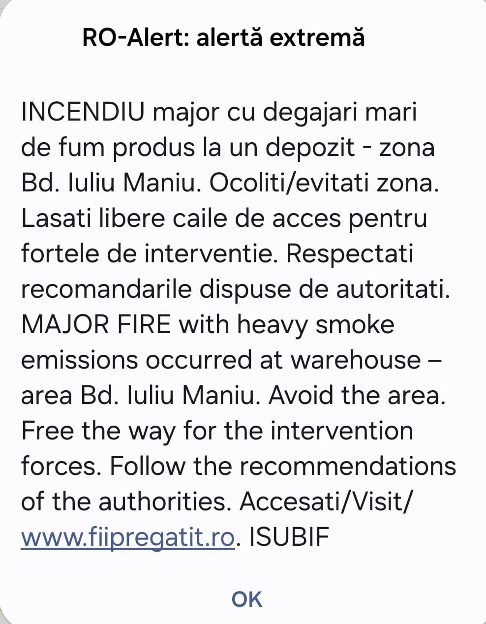 Pentru protecția populației, autoritățile au transmis un mesaj RO-Alert către locuitorii din Sectorul 6 și zonele adiacente.
