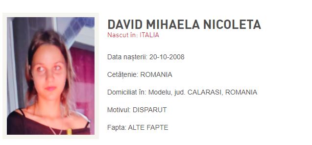 Astăzi, 29 noiembrie, oamenii legii au fost sesizați în legătură cu dispariția Mihaelei Nicoleta David, o adolescentă de 15 ani. Se pare că în această dimineață fata ar fi plecat în mod voluntar de la domiciliu, în jurul orei 6:00, fără să anunțe nici un membru al familiei. De atunci, nimeni nu mai are nici o informație despre ea, iar familia este disperată și a cerut ajutorul Poliției.