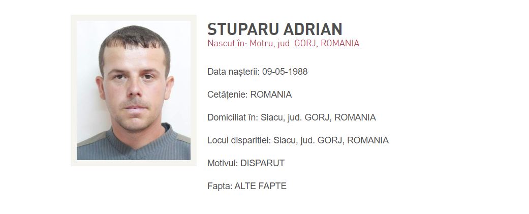„În data de 01.06.2024, ora 08:00, numitul Stuparu Adrian în vârstă de 36 ani, din comuna Slivilești, județul Gorj, a plecat în mod voluntar de la domiciliu și până în prezent nu a mai revenit.