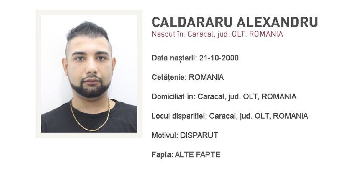 Căldăraru Alexandru – în vârstă de 24 de ani – a plecat de la domiciliul său din Caracal, județul Olt și nu a mai revenit. Pentru a facilita identificarea, oamenii legii au transmis semnalmentele sale. Cei care îl văd pe Căldăraru Alexandru trebuie să sune la 112 sau să se prezinte la cea mai apropiată secție de poliție, pentru a oferi toate detaliile. Procedura este prevăzută în Legea 141/2010 cu privire la semnalmentele persoanelor dispărute.