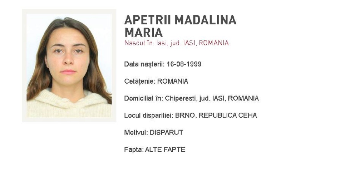 De curând, Apetrii Mădălina Maria, în vârstă de 25 de ani, a fost dată dispărută în orașul Brno din Republica Cehă. Autoritățile nu au reușit să dea de urma tinerei nici până la această oră. Nimeni nu știe unde s-ar putea alfa românca, dar și dacă a fugit fără să dea detalii despre locul unde merge sau dacă se află în pericol. Pentru a facilita identificarea, atât autoritățile din România, cât și cele din Cehia au adăugat-o pe lista persoanelor dispărute și au transmis semnalmentele sale.
