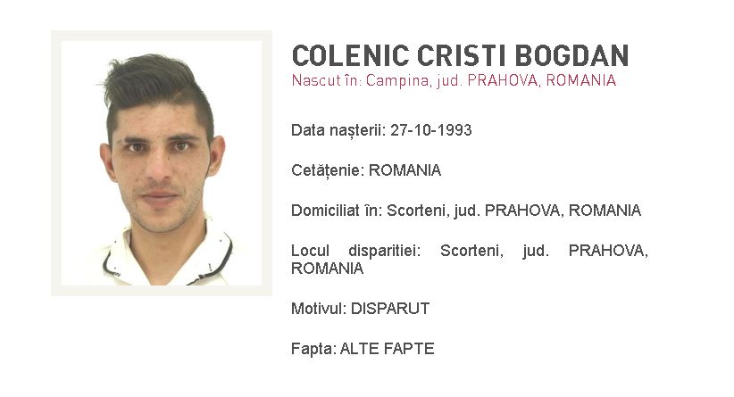 Persoanele care dețin informații sau l-au văzut pe Colenic Cristi Bogdan sunt rugate să se prezinte la cea mai apropiată unitate de poliție sau să apeleze numărul unic de urgențe 112.