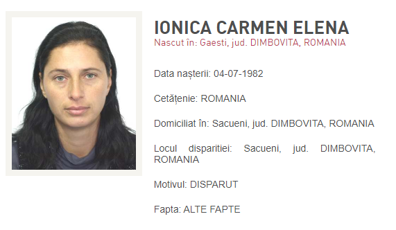 Recent, oamenii legii au fost sesizați în legătură cu dispariția numitei Ionica Carmen Elena, în vârstă de 42 ani, domiciliată în orașul Sacueni, județul Dâmbovița. Se pare că în ziua de 28 august, în jurul orei 18:30, aceasta a plecat voluntar de la domiciliu, într-o direcție necunoscută și nu a mai revenit până în prezent. Îngrijorați, apropiații au dat alarma, iar oamenii legii au demarat căutările.
