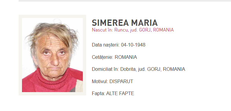 ”La data de 22.11.2025, în jurul orei 08:30, numita Simerea Maria, de 77 de ani, din comuna Runcu, județul Gorj, a plecat în mod voluntar de la domiciliu și până în prezent nu a mai revenit.