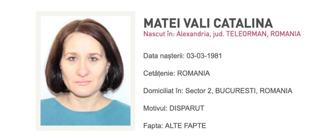 Alertă în Capitală! Vali Cătălina Matei (43 de ani), secretara șefă de la Universitatea de Medicină Carol Davila din București este dată dispărută. Femeia a plecat de acasă în cursul serii de marți spre miercuri – 17-18 septembrie 2024 – și de atunci nimeni nu mai știe nimic despre ea.