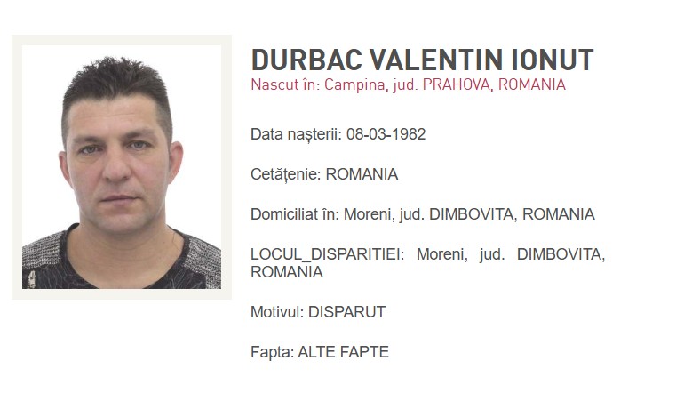 Recent, oamenii legii au fost sesizați cu privire la dispariția numitului Durbac Valentin Ionuț, în vârstă de 44 de ani, domiciliat în Moreni, județul Dâmbovița. Se pare că la data de 24 ianuarie 2026 acesta a plecat în mod voluntar de la domiciliu și nu s-a mai întors. Îngrijorați, apropiații au dat alarma, iar oamenii legii au demarat căutările.