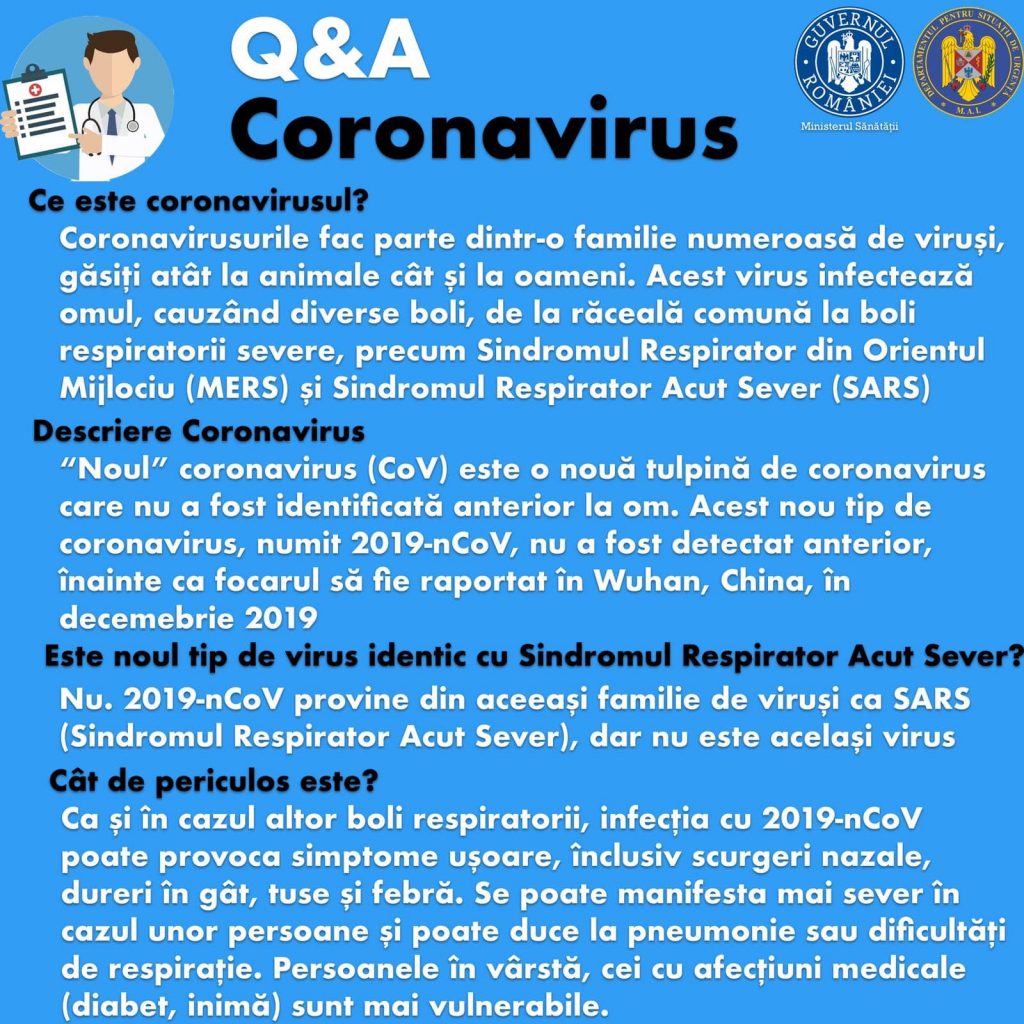 “Toate persoanele din carantină vor primi materiale informative cu un set de reguli pe care trebuie să îl urmeze, la fel și cele care vor fi izolate la domiciliu care vor primi un alt set de reguli. Aceste materiale vor fi elaborate de către reprezentanții Institutului de Sănătate Publică și transmise în timp util. Tot la institut va funcționa un telverde care va putea fi apelat de către cei interesați să obțină măsuri suplimentare despre noul tip de infecție cu coronavirus”, transmit oficialii Ministerului Sănătății.