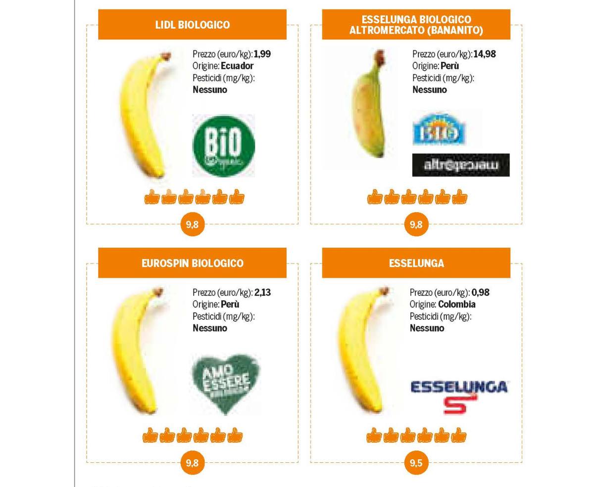 Ancheta realizată de „Il Salvagente” a scos la iveală faptul că din 20 de canale de distribuție a bananelor, doar 3 tipuri de banane și 1 de banane mici (bananito) nu au pesticide în pulpă. În restul cazurilor nu se depăsește norma impusă de lege, însă cu siguranță nu este plăcut. Cercetătorii italieni au analizat 20 de tipuri de banane din supermarketurile de la ei. Multe dintre ele nu sunt salvate de contaminarea cu pesticide, nici măcar cele organice. Singura excepție sunt cele 4 tipuri de banane, prezentate mai jos.