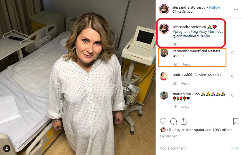 Alessandra Stoicescu a devenit mămică în această dimineață, după ce a ajuns la clinica privată pe care a ales-o ca să își aducă pe lume mica prințesă. Înainte să intre în sala de nașteri, cunoscuta vedetă a împărtășit cu apropiații și fanii că a sosit marele eveniment. Ea s-a fotografiat în salon, iar în dreptul imaginii pe care a făcut-o publică a spus un emoticon care simbolizează rugăciune și unul iubire și a pus mai multe hastag-uri: “?❤️ #pregnant #big #day #birthday@constantinescusergiu (#însărcinată #ziuaceamare #zidenaștere)”.