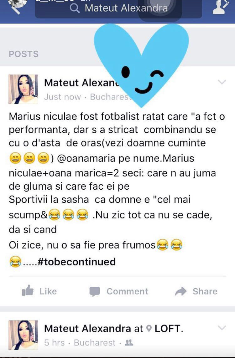 ”Marius Niculae fost fotbalist ratat care a făcut o performanţă dar s-a stricat combinandu-se cu o d-asta de oraş (vezi doamne cuminte) @oanamaria pe nume. Marius Niculae + Oana Marica= 2 seci care n-au juma de glumă şi care fac ei pe Sportivii la sasha că vezi domne e cel mai scump. Nu zic tot că nu se cade da şi când oi zice nu o să fie pre frumos #tobecontinued”
