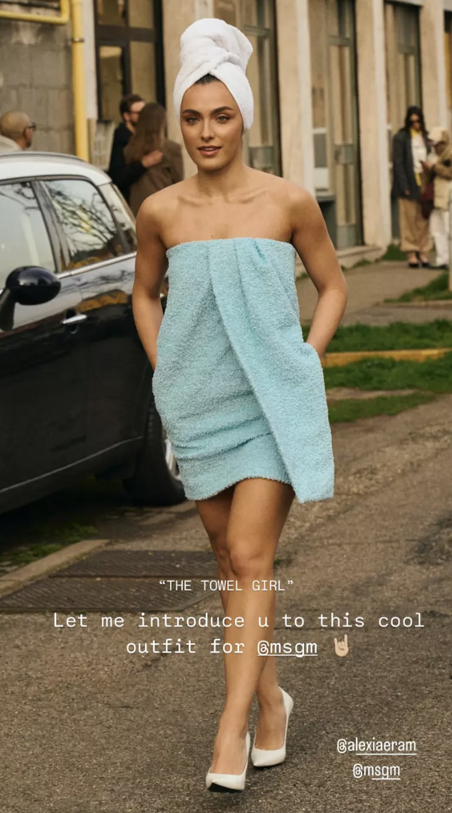 Una dintre aparițiile sale a devenit rapid virală pe rețelele de socializare și în presa de specialitate. Alexia a fost surprinsă pe străzile din Milano într-o ținută neconvențională, care imita un prosop de baie. Look-ul inedit a fost completat de accesorii sofisticate și un machiaj impecabil, transformând o alegere vestimentară atipică într-un adevărat statement fashion. Această apariție a generat discuții, iar imaginile au fost preluate imediat.