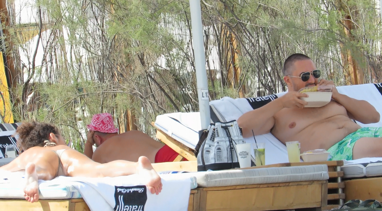 La scurt timp după ce și-a răsfățat iubitul, a venit vremea ca șatena să se bucure de soare, astfel că s-a întins pe șezlong și s-a lăsat „îmbrățișată” de razele puternice ale soarelui. În tot acest timp, iubitul ei a preferat să se relaxeze sub umbrelă, butonând telefonul și savurând un porumb fiert.