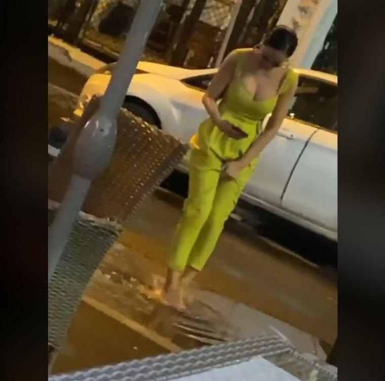 Îmbrăcată elegant, Bianca se descalță și intră cu picioarele într-o baltă, unde începe să se bălăcească, desigur, în timp ce nu își dezlipea ochii din ecranul telefonului mobil.