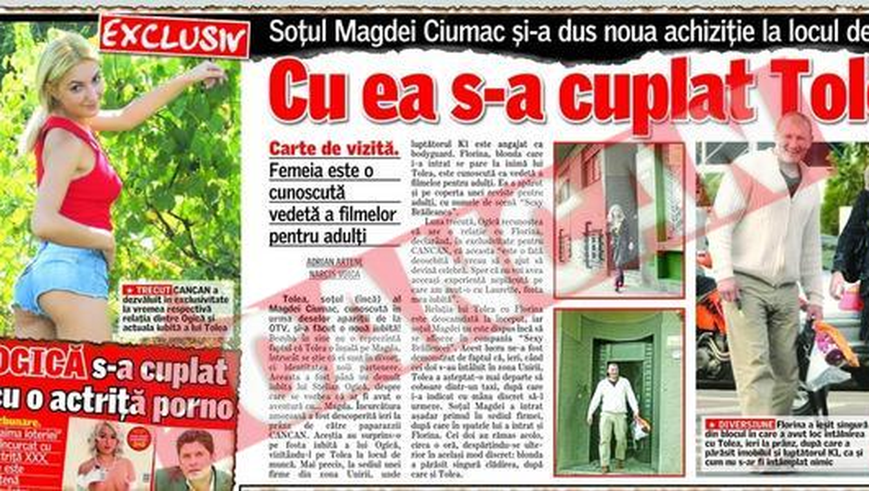 ALES. Stelian Ogica este preferatul blondei XXX Alegere. Actrita porno sustine ca doreste sa se intoarca in patul giurgiuveanului Stelian Ogica, fiindca Tolea a amenintat-o ca „o ingroapa ca pe Elodia” Narcis Voica Fosta iubita a giurgiuveanului, care a fost surprinsa de paparazzii CANCAN la o intalnire cu Tolea, sustine ca a fost amenintata de luptatorul K1 si ca ar vrea sa se intoarca la Ogica. Florina, actrita porno de 20 de ani care a marturisit ca se prostitueaza de cand si-a luat buletinul, a declarat pentru CANCAN ca a trecut prin patul mai multor vedete, printre care si Stelian Ogica si Tolea Ciumac. „Pe Tolea l-am chemat la Braila si am petrecut impreuna weekendul trecut. Am fost la mall in Braila, la cazinouri, la restaurante prin Galati si Tecuci. Ne-am cazat la un hotel si am facut sex. Cand ne-au fotografiat paparazzii, eu abia venisem in Bucuresti, la o emisiune TV, si am vrut sa-l vad si pe Tolea, macar cateva minute”, a declarat Sexy-braileanca. Ea si-a amintit si de intalnirea cu Stelian Ogica, ce a avut loc in urma cu cateva saptamani: „M-a dus la motelul unde a dus-o si pe prietena mea, Laurette. La capitolul sex, Ogica e de nota 10, iar Tolea e cam de 6”. Florina sustine ca, dupa aparitia articolului „Tolea i-a luat gagica lui Ogica”, sotul Magdei Ciumac a sunat-o si a amenintat-o: „Daca vorbesti cu ziaristii despre relatia noastra, o sa te ingrop ca pe Elodia!”. Desi blonda XXX s-a aratat dispusa sa inceapa o relatie serioasa cu Ogica, acesta a tinut sa precizeze ca nu mai are de gand sa se incurce cu Florina: „Este o fata de treaba, dar eu sunt deja implicat intr-o alta relatie…”.