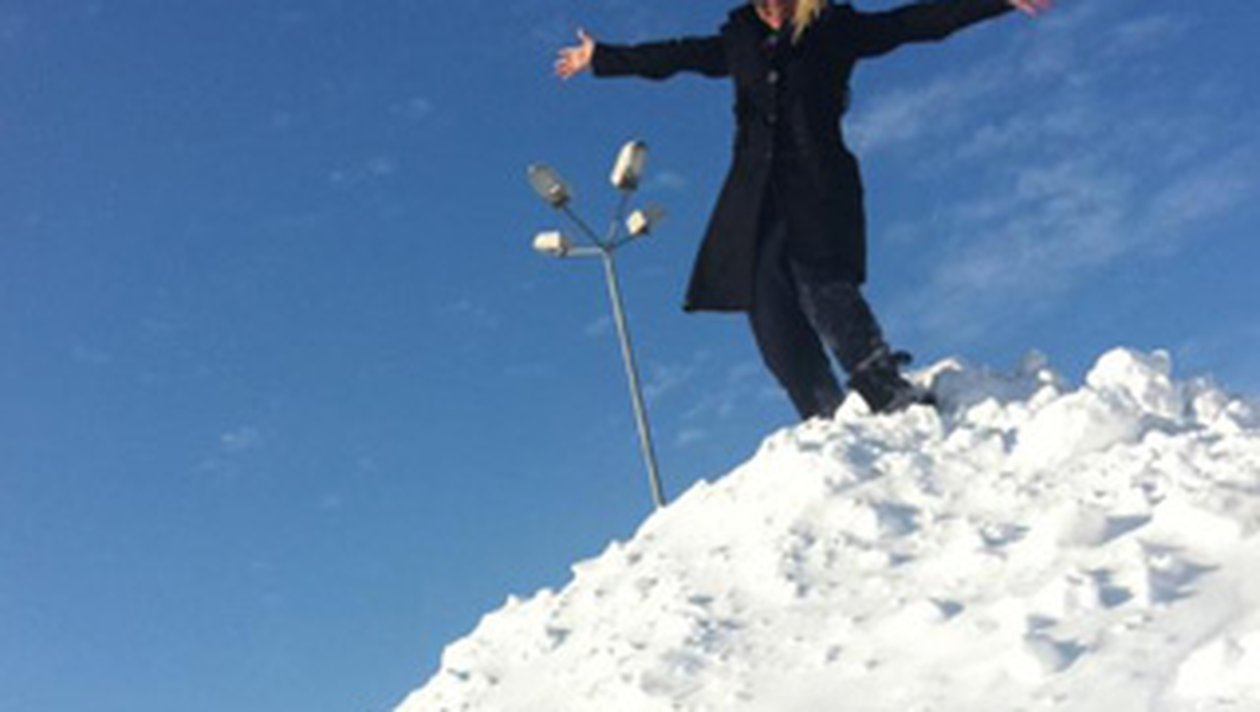 Asa se explica si fotografia pe care blonda a postat-o fericita pe Facebook. Anda s-a urcat pe un adevarat munte de zapada, pentru ca se poate vedea foarte usor cat de aproape este de un stalp electric aflat in spate.