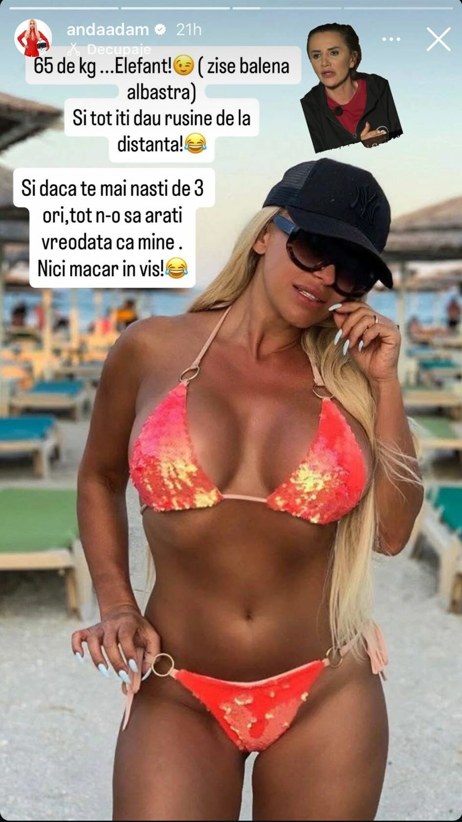 Scandalul a luat amploare după ce, potrivit zvonurilor, Mara Bănică ar fi făcut o remarcă jignitoare, numind-o pe Anda Adam „elefant”. Artista nu a rămas indiferentă și a reacționat imediat pe rețelele de socializare. Pe Instagram, Anda a publicat mai multe imagini vechi din sala de fitness, unde și-a arătat silueta tonifiată și abdomenul cu pătrățele, subliniind că are doar 65 de kilograme și că își menține forma prin multă muncă și disciplină.